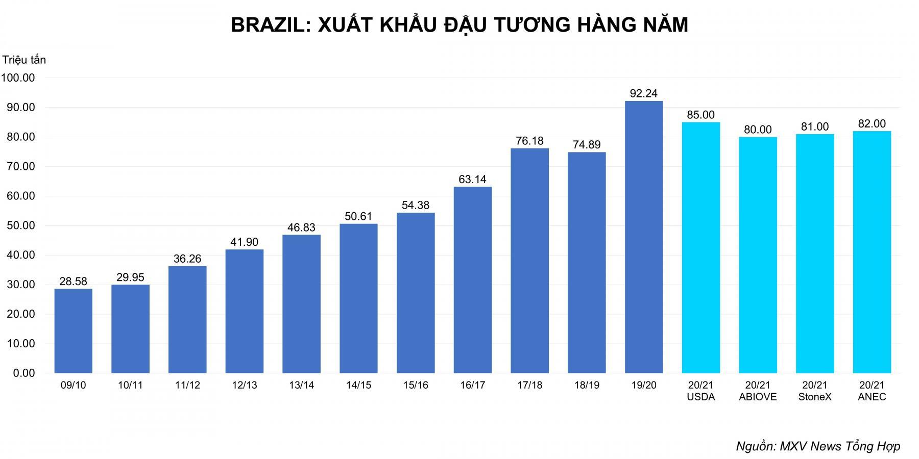 Hãng tư vấn Datagro vừa tăng dự báo xuất khẩu đậu tương niên vụ 2021/22 của Brazil lên mức 90.5 triệu tấn, cao hơn 3.4% so với cùng kỳ năm trước. Đối với đậu tương niên vụ 2020/21, tổng mức xuất khẩu dự báo đạt 87.5 triệu tấn, tăng 4.9% so với cùng kỳ năm 2020.